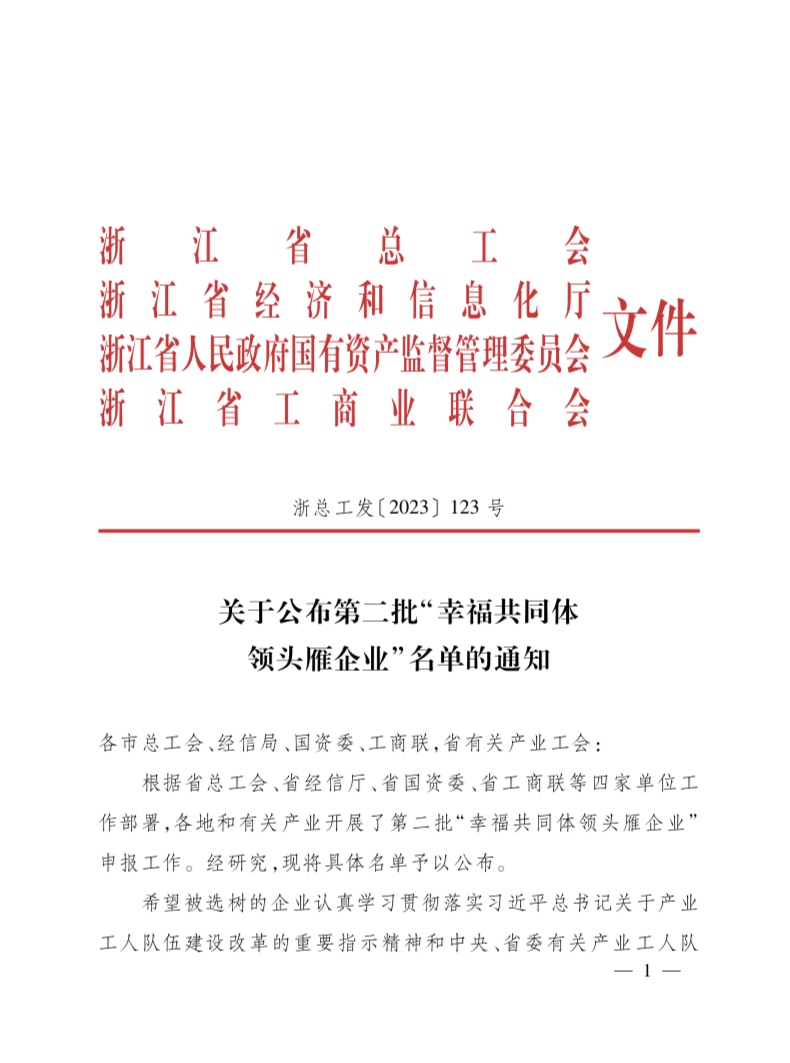 近日,根據(jù)省總工會、省經(jīng)信廳、省國資委、省工商聯(lián)等四家單位工作部署,各地和有關(guān)產(chǎn)業(yè)開展了第二批“幸福共同體 領(lǐng)頭雁企業(yè)”申報工作。我司 “浙江杭機股份有限公司”入選“幸福共同體 領(lǐng)頭雁企業(yè)”。